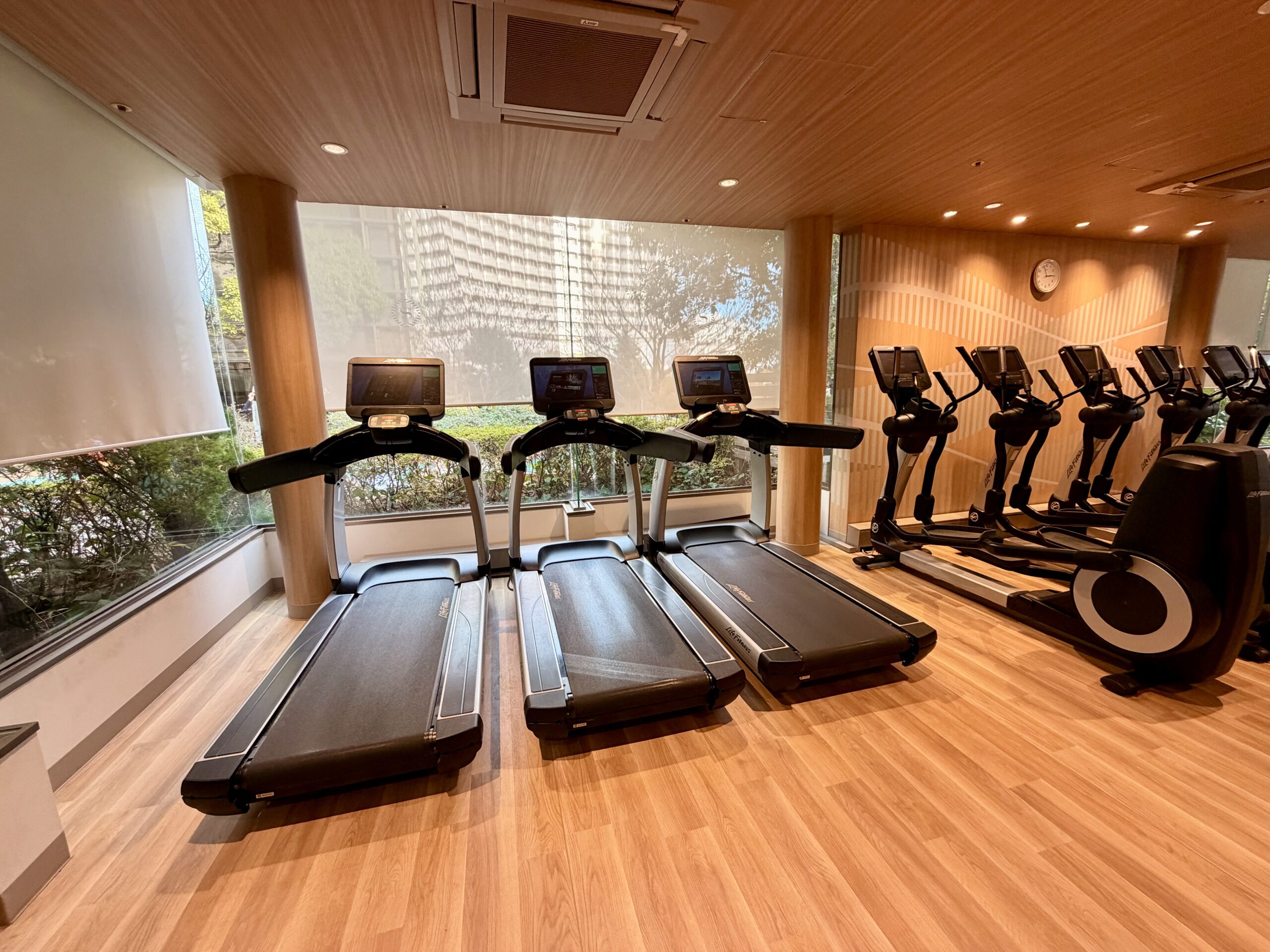ジムエリアとしてはかなり広く、有酸素マシンの数としては首都圏最大クラスと思われます。マシンエリアも充実しており、ダンベルは30kgまであり各部位のマシンに加えケーブルマシンも配備されています。環境としても施設はリノベーションされておりとても綺麗で、庭園の緑やプールを眺めながらトレーニングを行うことが可能です。また、広いスタジオが併設されており、ヨガのクラスなどにも対応しているものと思われます。