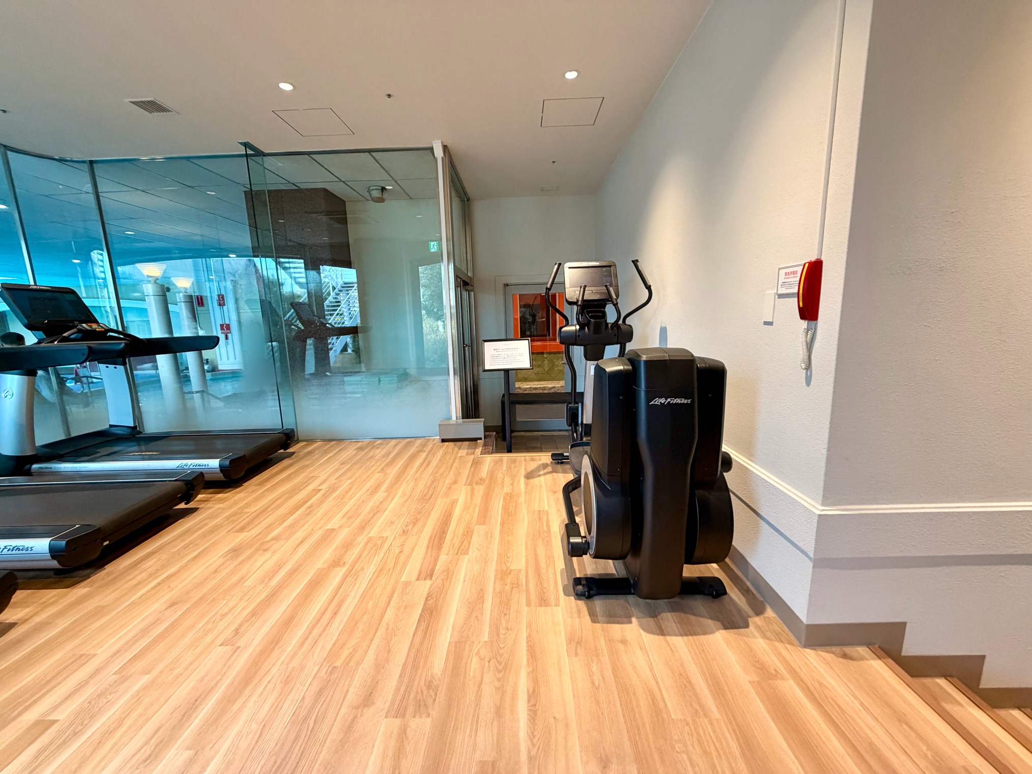 綺麗でトレッドミルやクロストレーナーがたくさん置いてあります。プールが見えて雰囲気もとても良いです。