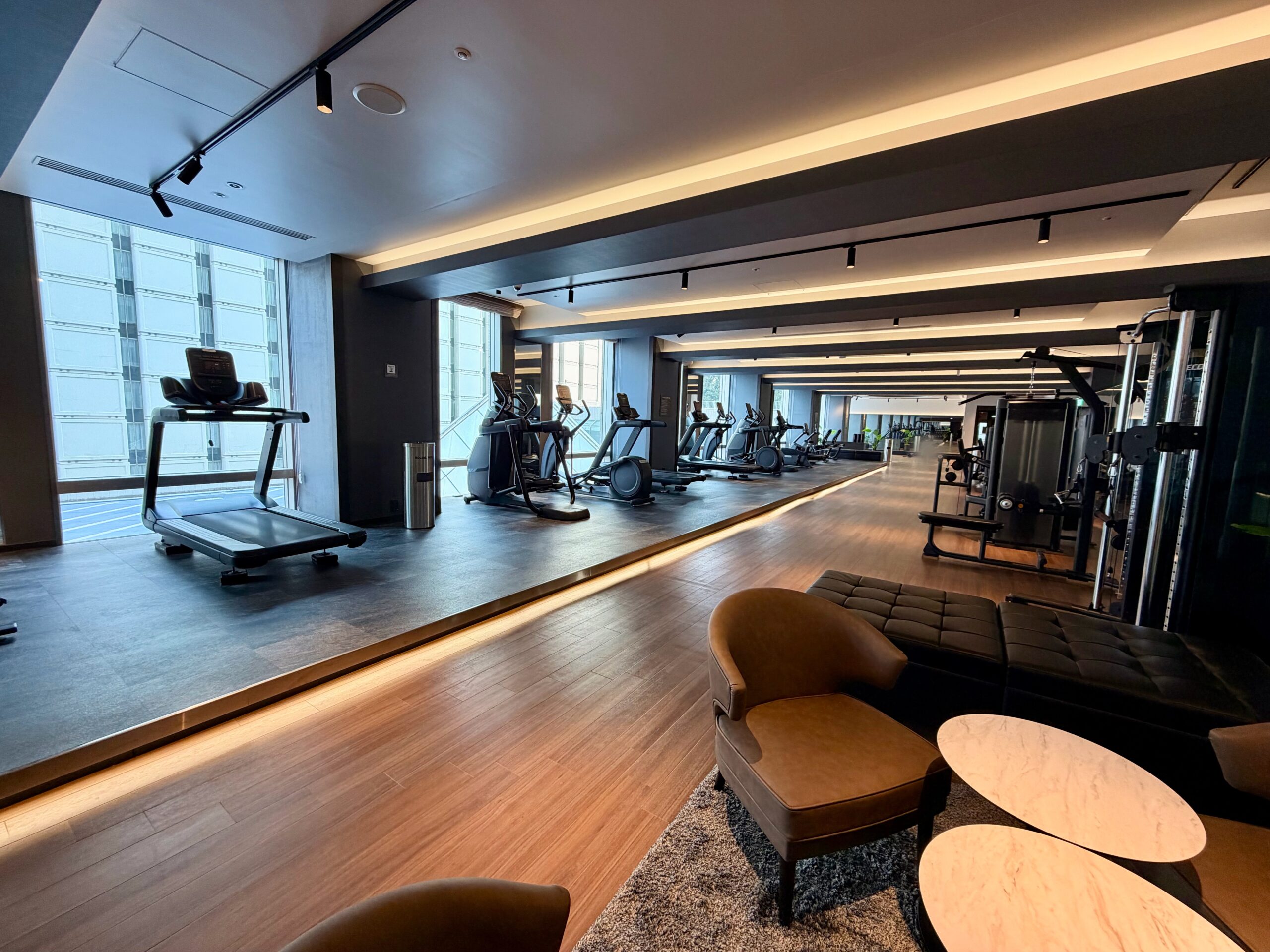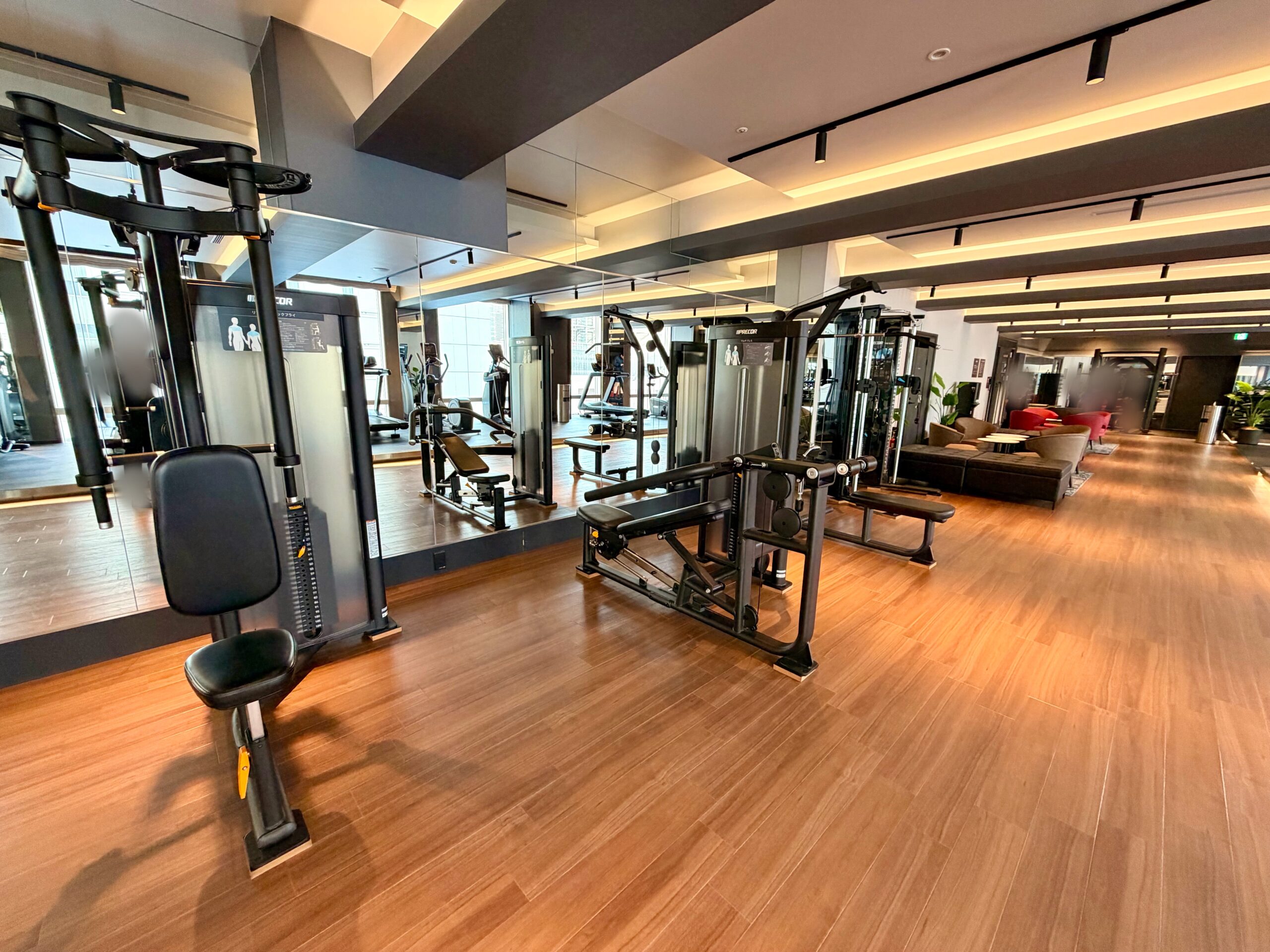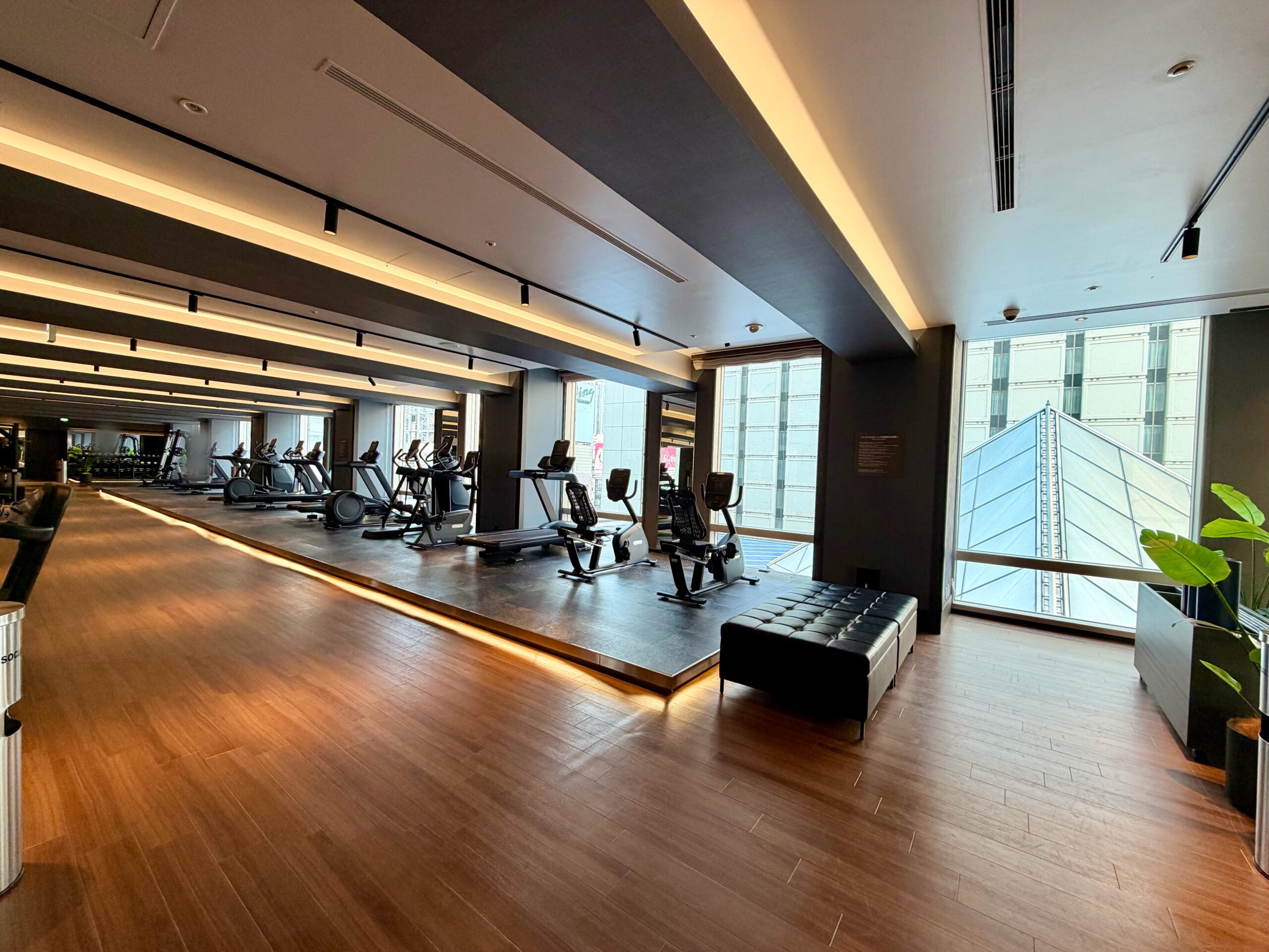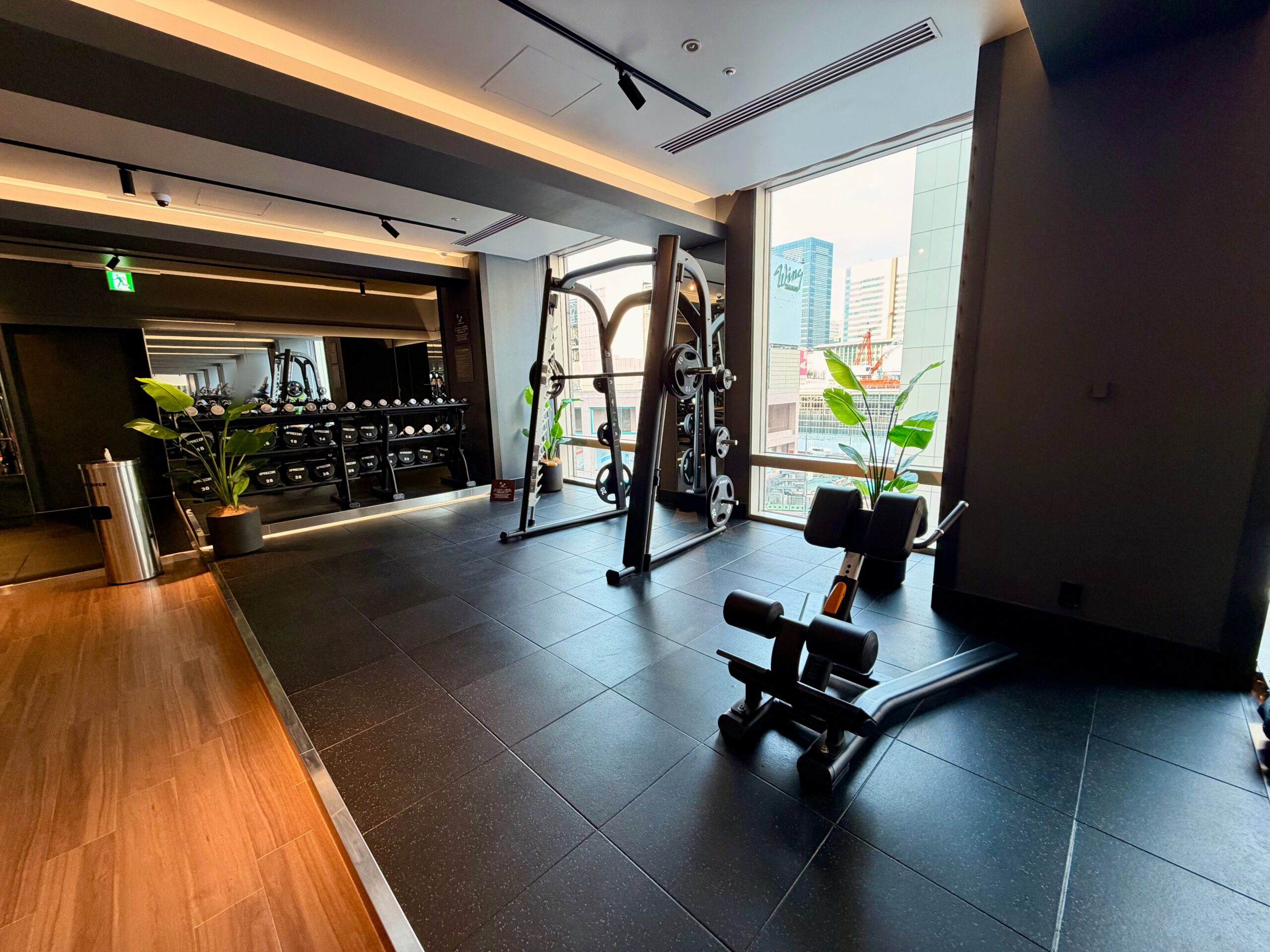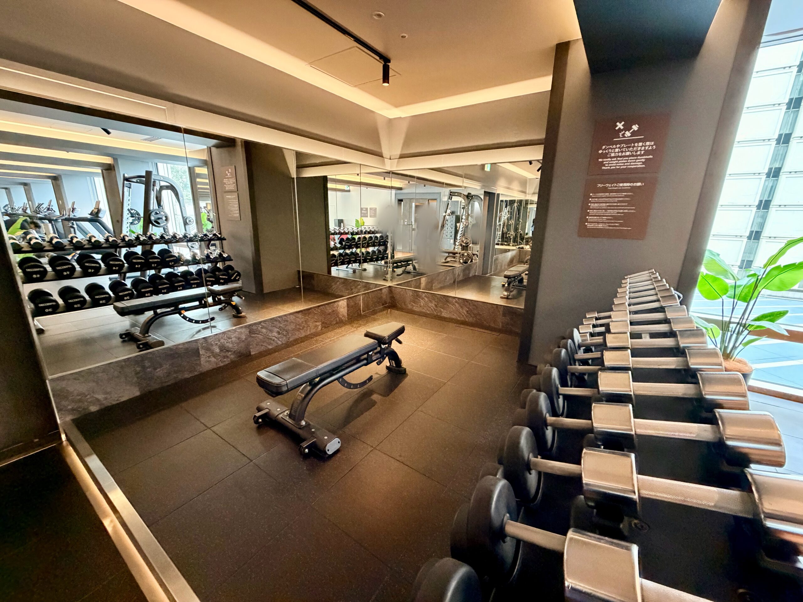 もともとレストランだったスペースを2024年に改装しており、ジムエリアとしてはとても広く開放感のある空間が設けられています。マシンの台数や有酸素マシンの数もホテルジムとしてはかなりの台数がバランスもよく配備されており、スミスマシンや30㎏のダンベルも設置されているため、ホテルに滞在しながらも高強度の充実のトレーニングを送ることが可能です。改装後間もないため施設も非常にきれいで、マシンも新品のためとても快適に過ごせる環境です。また、メインタワー以外の棟に宿泊されている方も利用可能であり、品川プリンスホテル全体からのアクセスも担保されています。