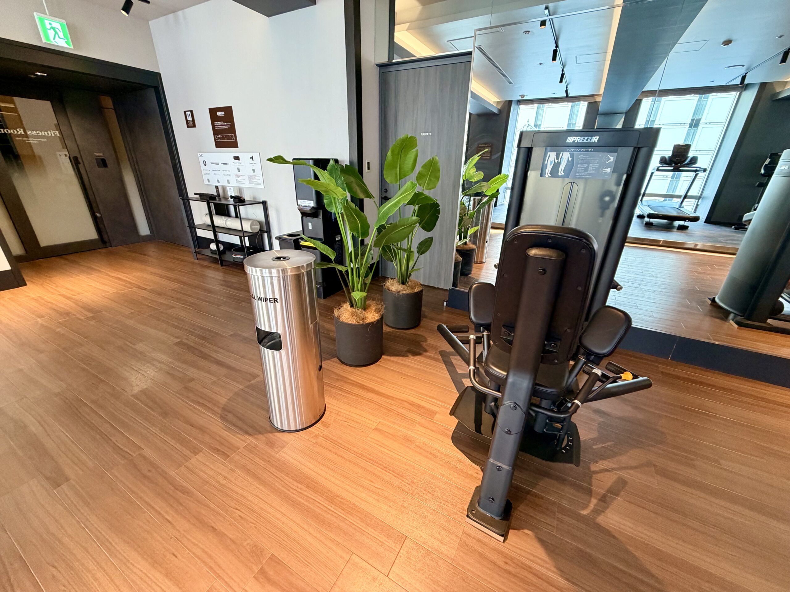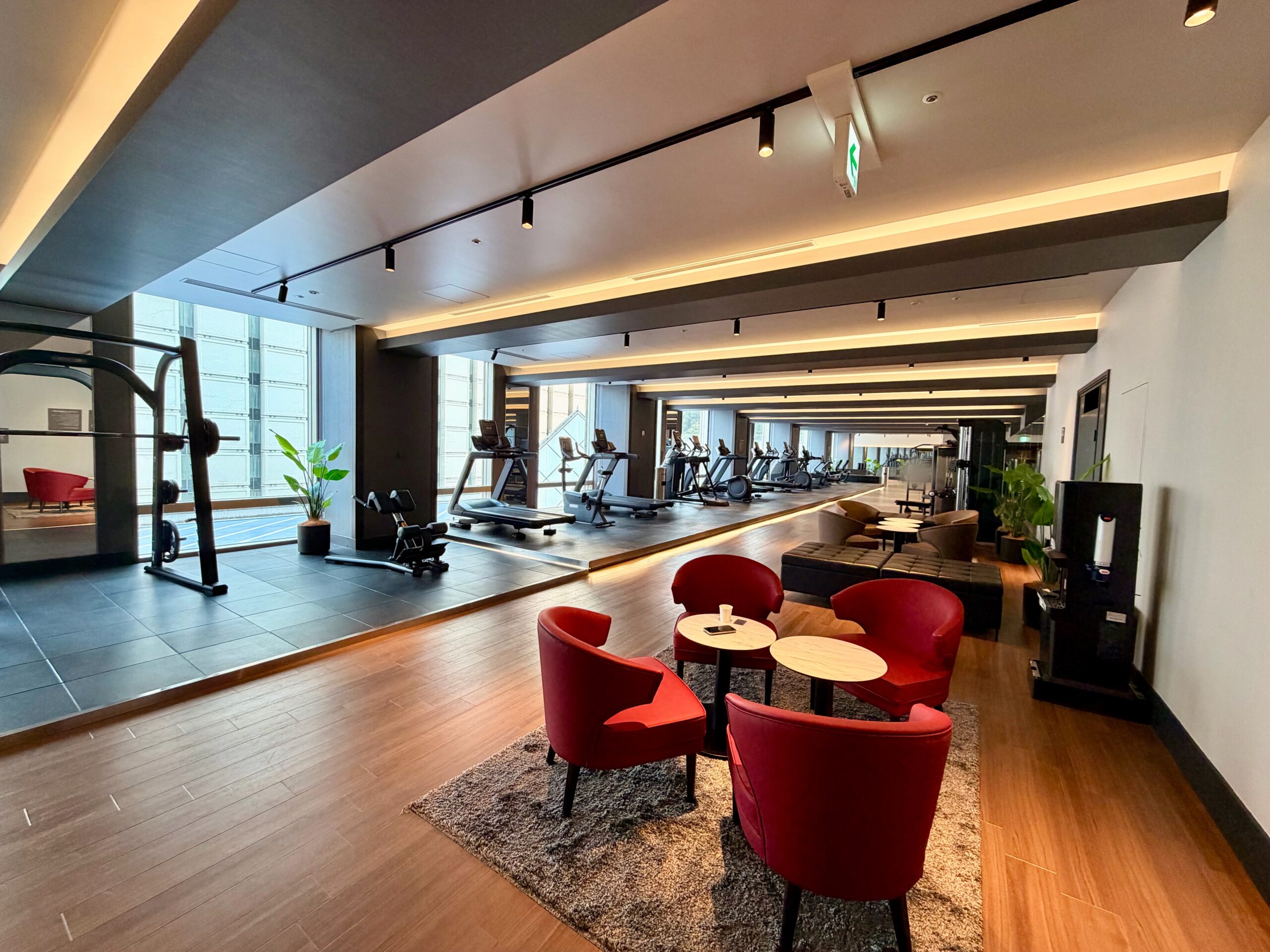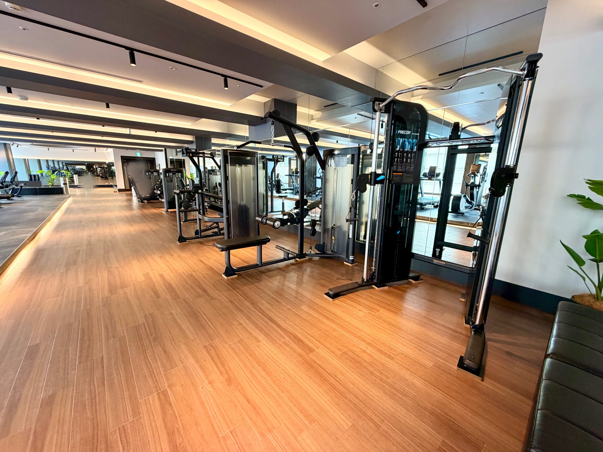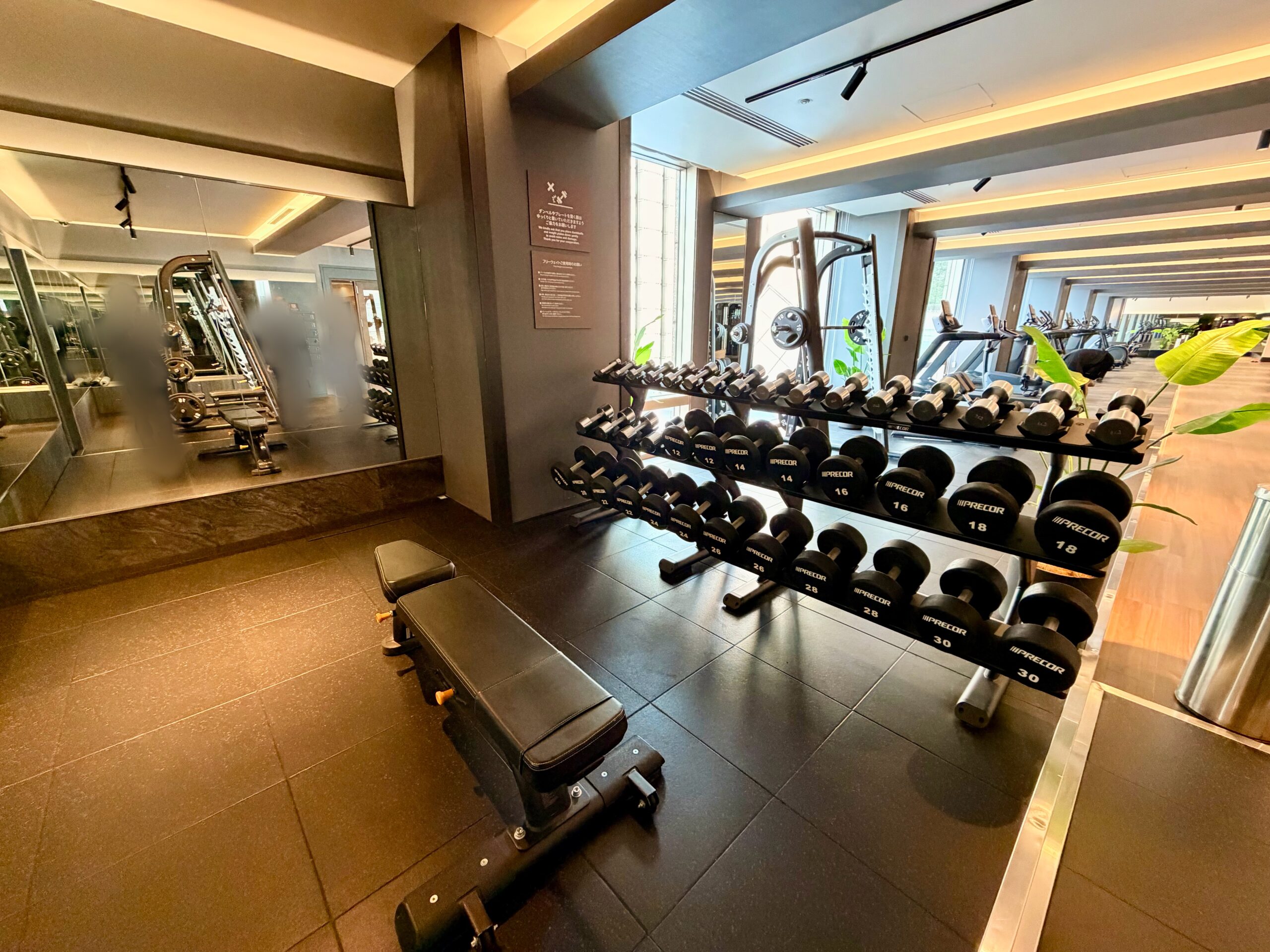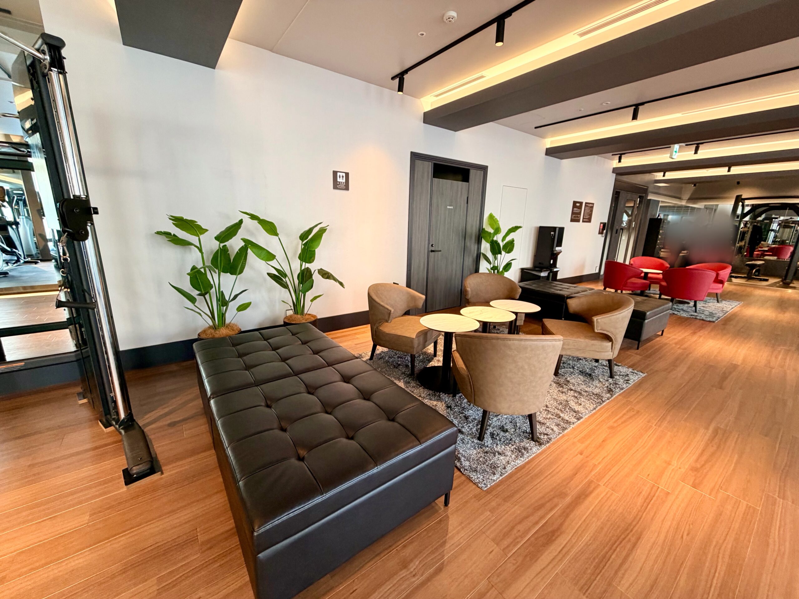 もともとレストランだったスペースを2024年に改装しており、ジムエリアとしてはとても広く開放感のある空間が設けられています。マシンの台数や有酸素マシンの数もホテルジムとしてはかなりの台数がバランスもよく配備されており、スミスマシンや30㎏のダンベルも設置されているため、ホテルに滞在しながらも高強度の充実のトレーニングを送ることが可能です。改装後間もないため施設も非常にきれいで、マシンも新品のためとても快適に過ごせる環境です。また、メインタワー以外の棟に宿泊されている方も利用可能であり、品川プリンスホテル全体からのアクセスも担保されています。